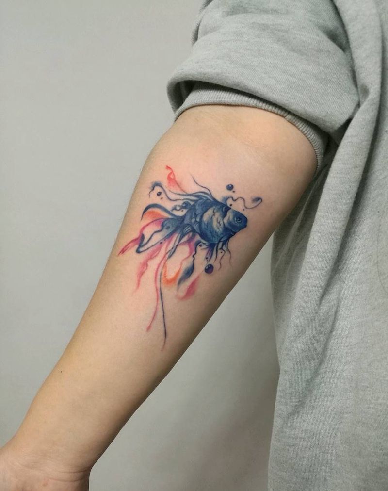 当前位置: 首页 >辽宁省沈阳市纹身店-天刺烙印纹身图案>金鱼纹身图片_手臂腿部水彩水墨鱼金鱼纹身图案