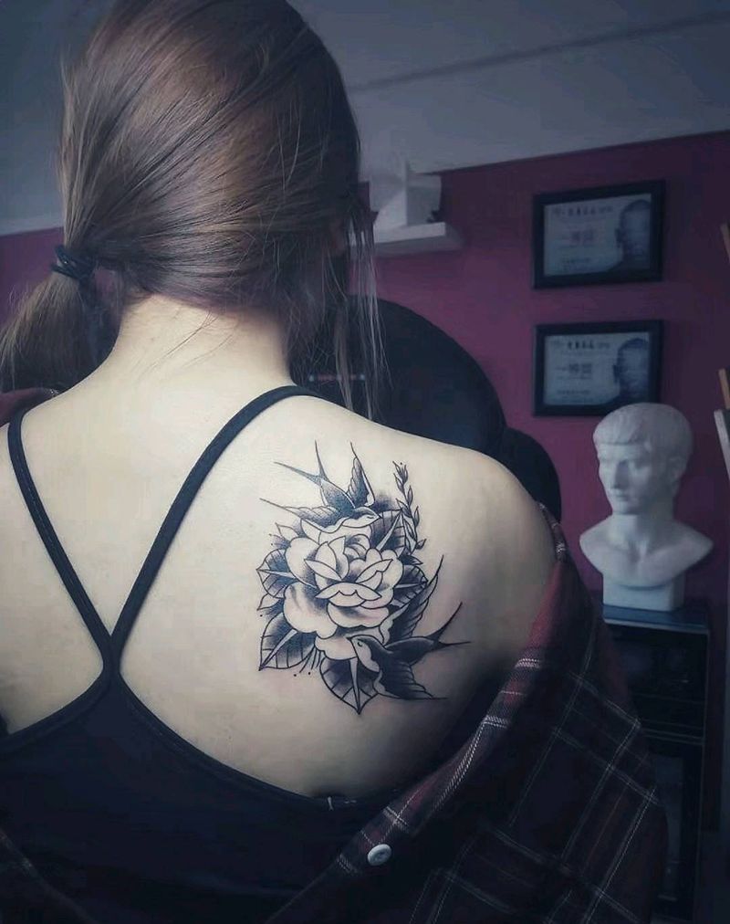 燕子纹身图片_肩部背部Old SchoolNew School燕子花玫瑰纹身图案