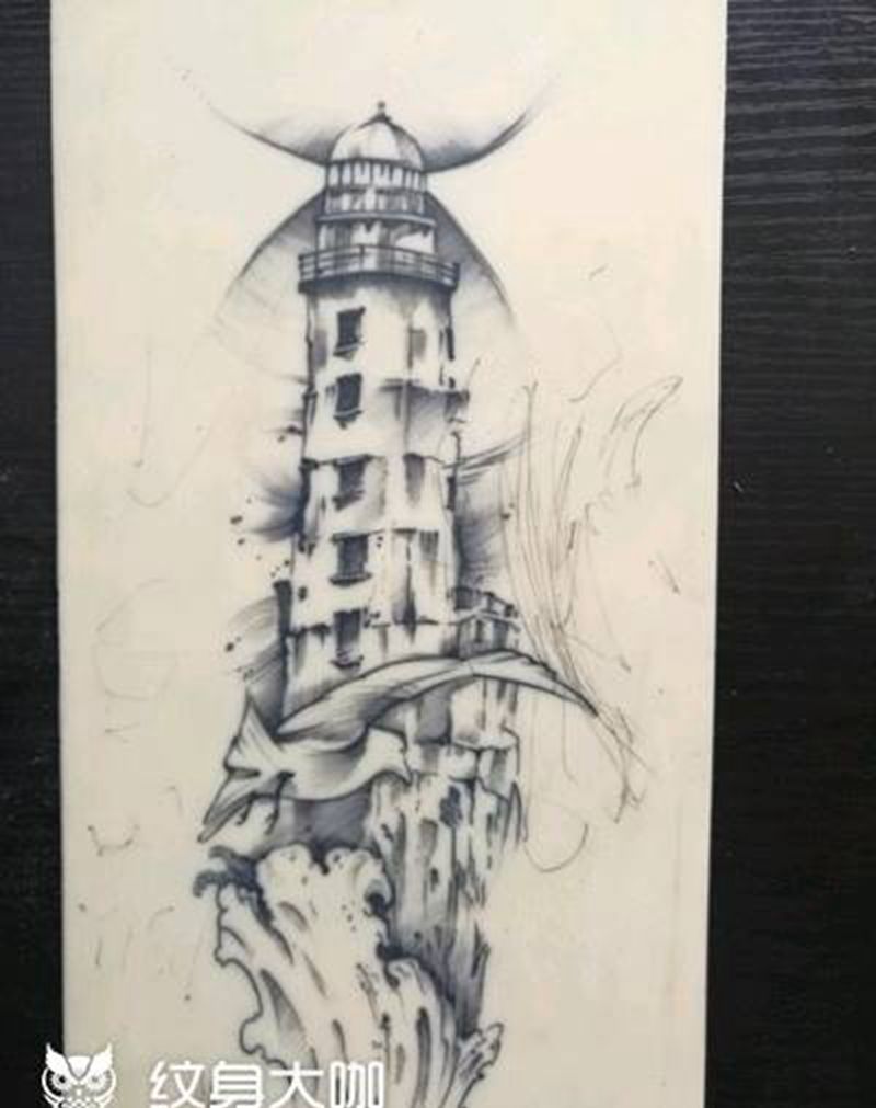 学员作品纹身图片_手臂腰部欧美写实水彩表荷花灯塔纹身图案