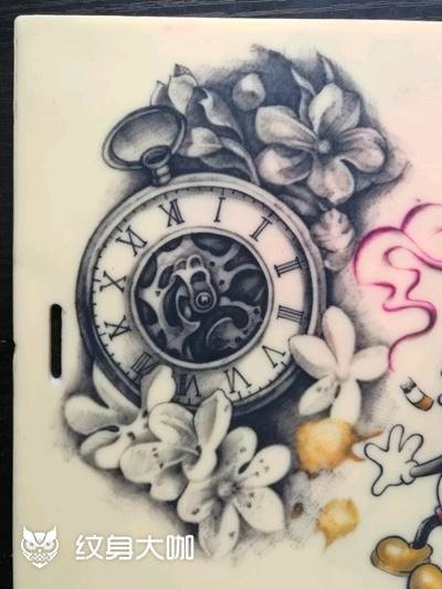 学员作品纹身图片_手臂腿部欧美写实New School怀表花卡通纹身图案
