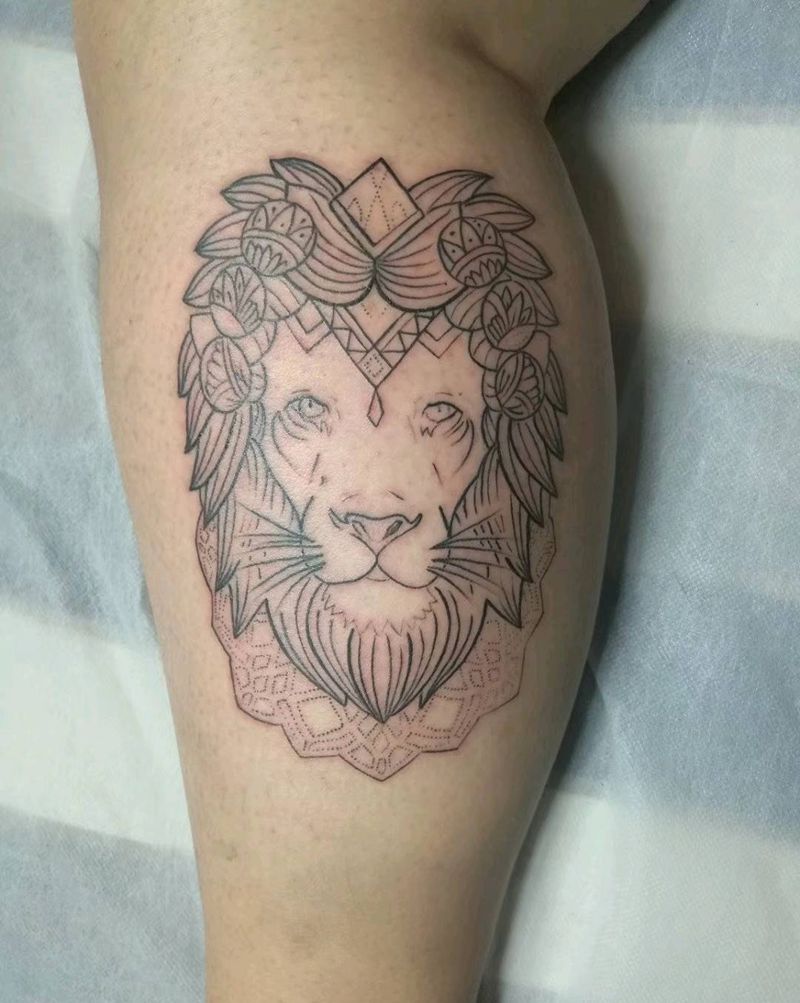 当前位置: 首页 >辽宁省沈阳市纹身店-天刺烙印纹身图案>小腿狮子纹身图片_腿部手臂新传统点刺狮子纹身图案