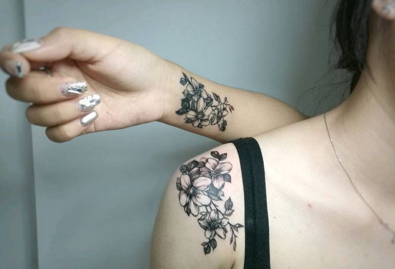 当前位置: 首页 >辽宁省沈阳市纹身店-天刺烙印纹身图案>闺蜜同款素花纹身图片_肩部手臂新传统花素花小清新纹身图案