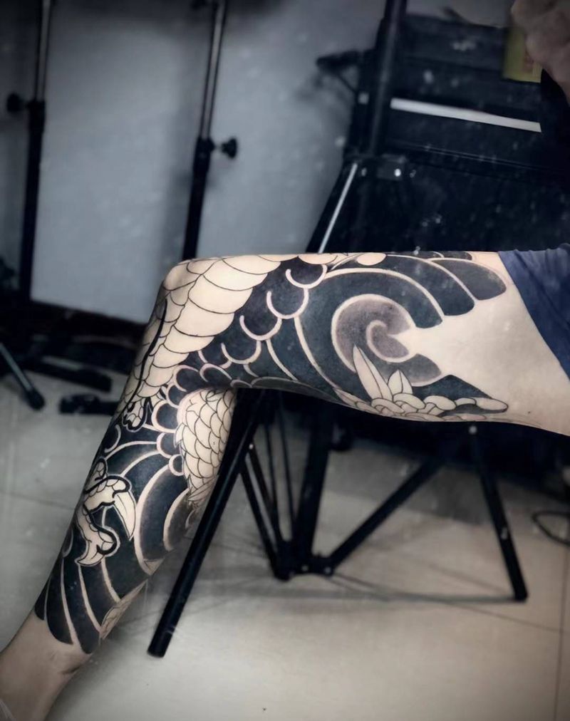 • T网红王老大花腿龙纹身图片_腿部新传统纹身图案