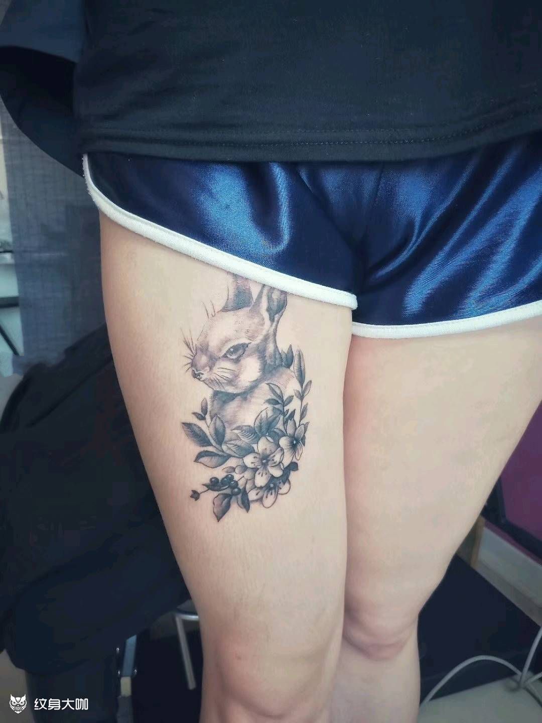 兔子大腿外侧纹身图片_腿部手臂新传统欧美写实兔子纹身图案