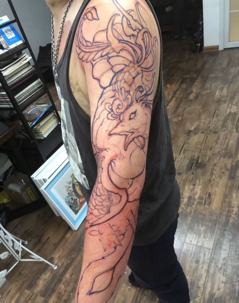 当前位置: 首页 >辽宁省沈阳市纹身店-沈阳千手刺青工作室纹身图案>凤凰花臂纹身图片_手臂新传统纹身图案