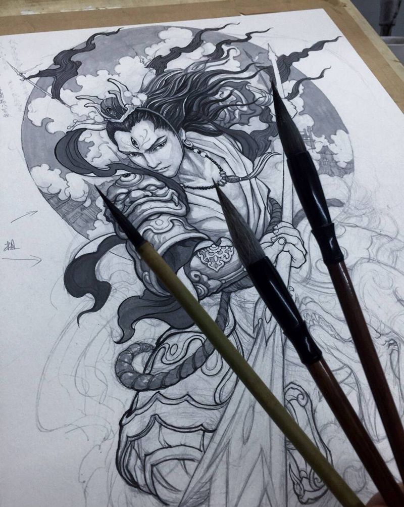 当前位置: 首页 >辽宁省沈阳市纹身店-沈阳千手刺青工作室纹身图案>原创满背二郎神手稿纹身图片
