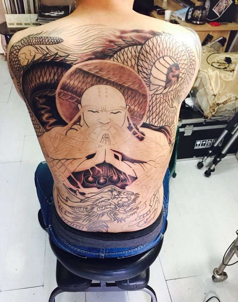 降龙罗汉纹身图片_成品手稿背部传统人物宗教纹身图案