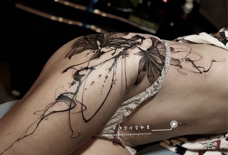 大连华龙堂刺青纹身图片_腿部水墨纹身图案