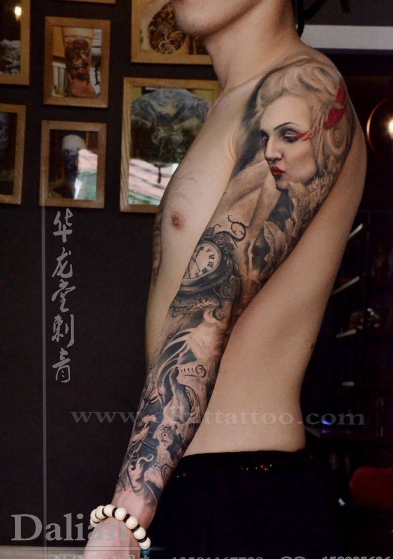 大连华龙堂刺青纹身图片_成品胸部腿部手臂欧美传统习俗肖像清新写实纹身图案