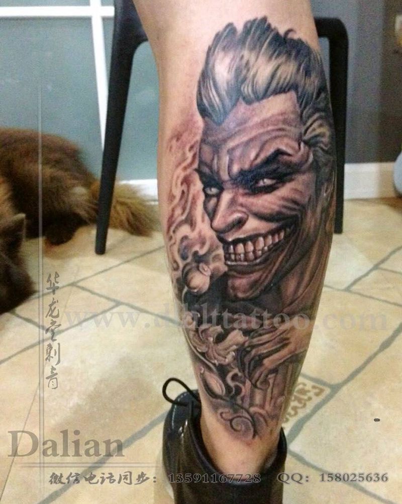 大连华龙堂刺青纹身图片_成品腿部欧美传统习俗写实肖像原创纹身图案
