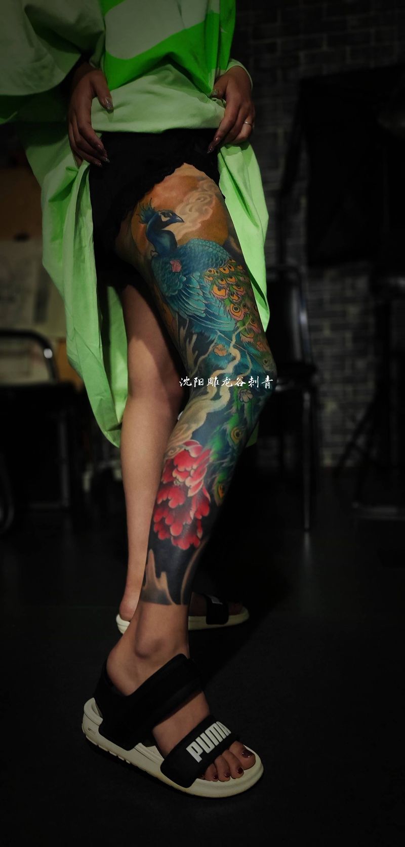 当前位置: 首页 >辽宁省沈阳市纹身店-沈阳雕龙谷刺青纹身图案>美女孔雀彩色花腿纹身图片_腿部新传统纹身图案