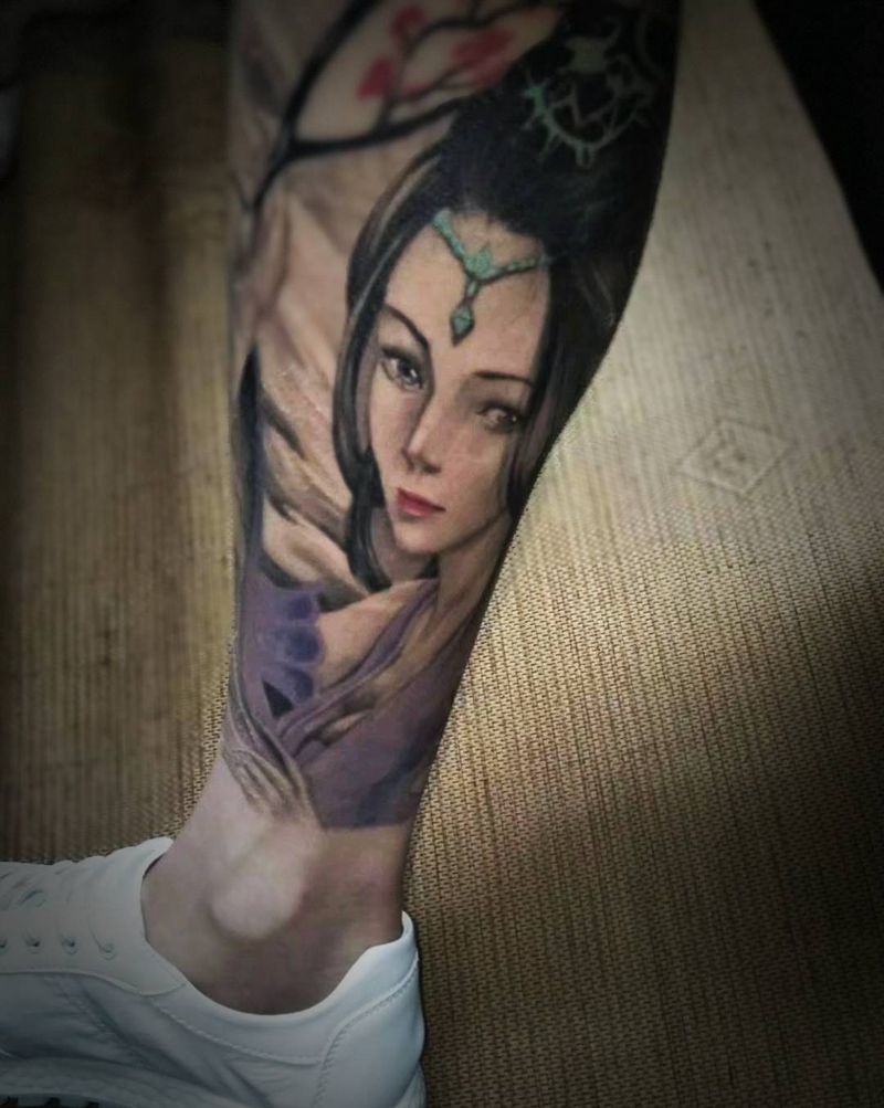 当前位置: 首页 >辽宁省沈阳市纹身店-沈阳雕龙谷刺青纹身图案>古风美女纹身图片_腿部新传统水彩纹身图案
