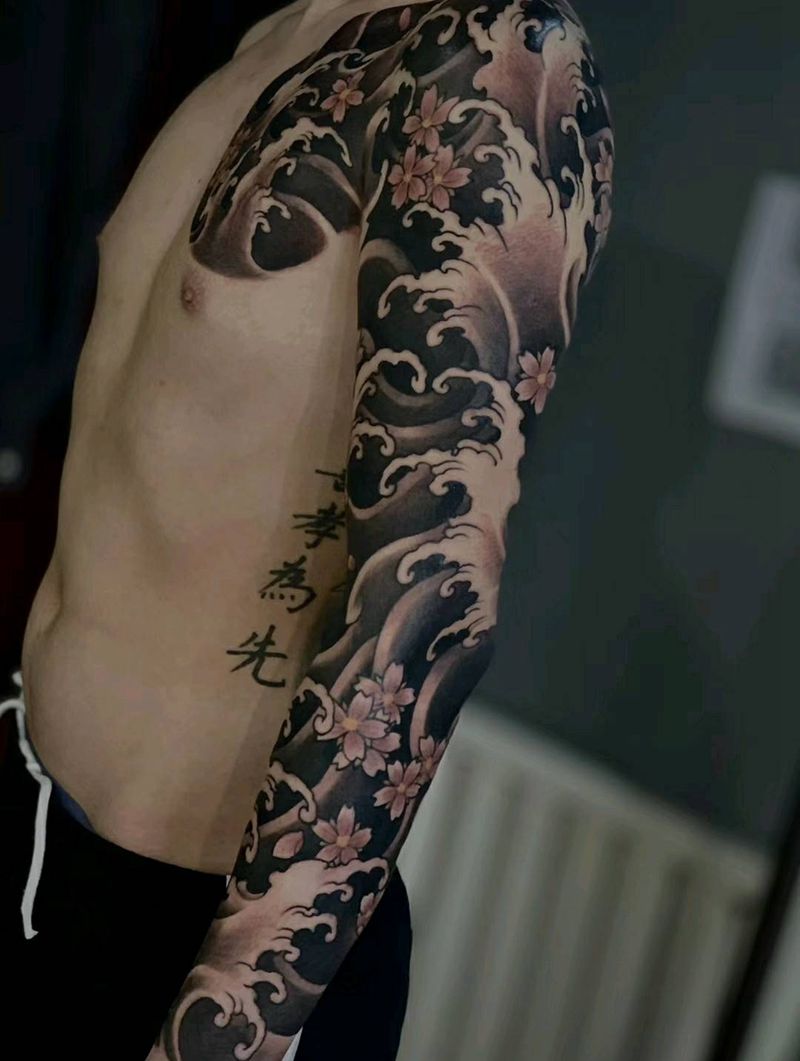 当前位置: 首页 >辽宁省沈阳市纹身店-沈阳雕龙谷刺青纹身图案>雕龙谷刺青 水浪花臂纹身图片_手臂胸部老传统纹身图案