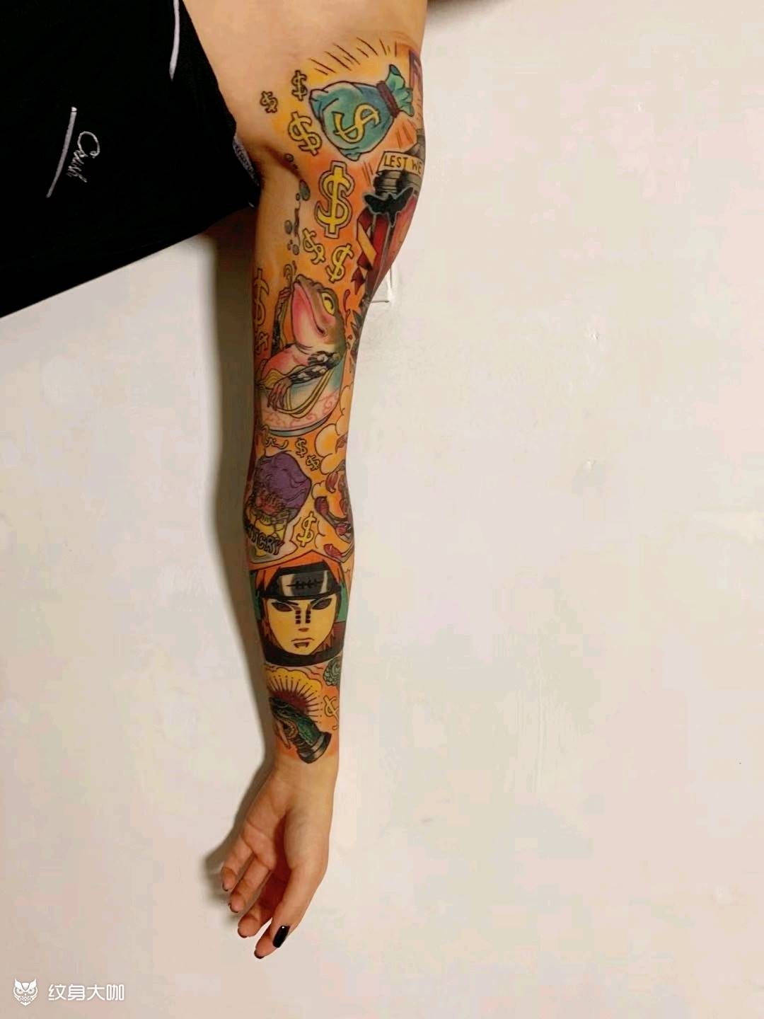 当前位置: 首页 >辽宁省沈阳市纹身店-沈阳雕龙谷刺青纹身图案>2020年彩色花臂秀纹身图片_手臂New School纹身图案