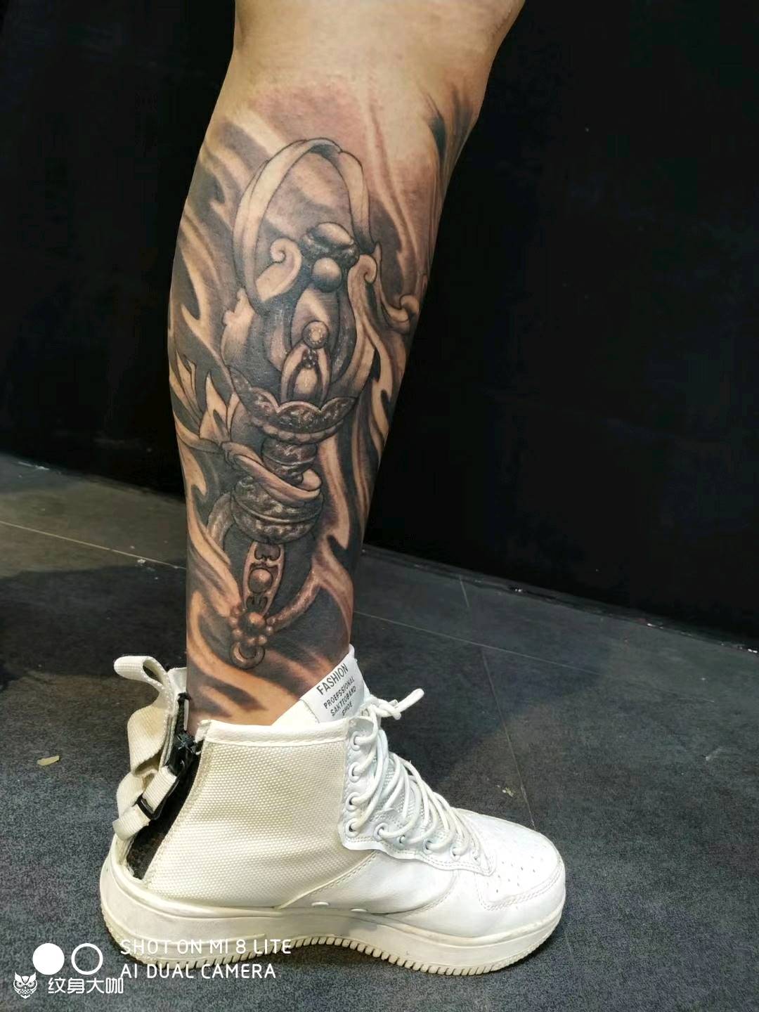 大黑天财神 降魔杵抱小腿纹身图片_腿部老传统纹身图案