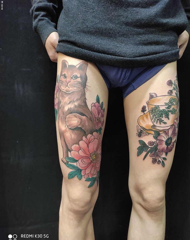 猫纹身图片_腿部New School纹身图案