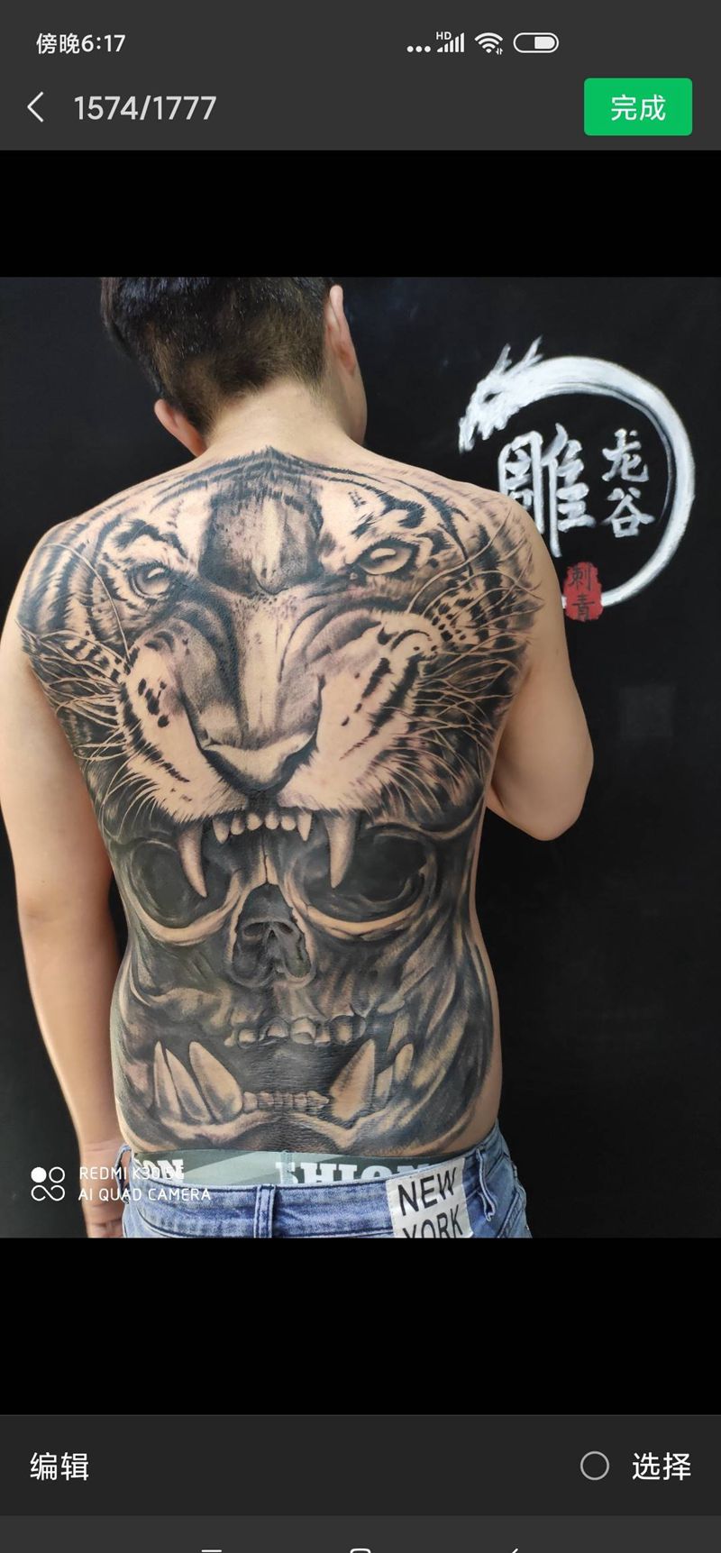 沈阳雕龙谷刺青经典虎头纹身图片_背部欧美写实新传统纹身图案