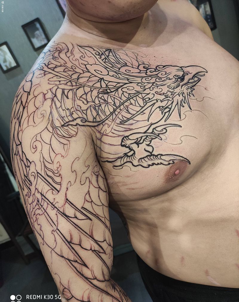 当前位置: 首页 >辽宁省沈阳市纹身店-沈阳雕龙谷刺青纹身图案>过肩凤凰线条之美纹身图片_手臂新传统纹身图案