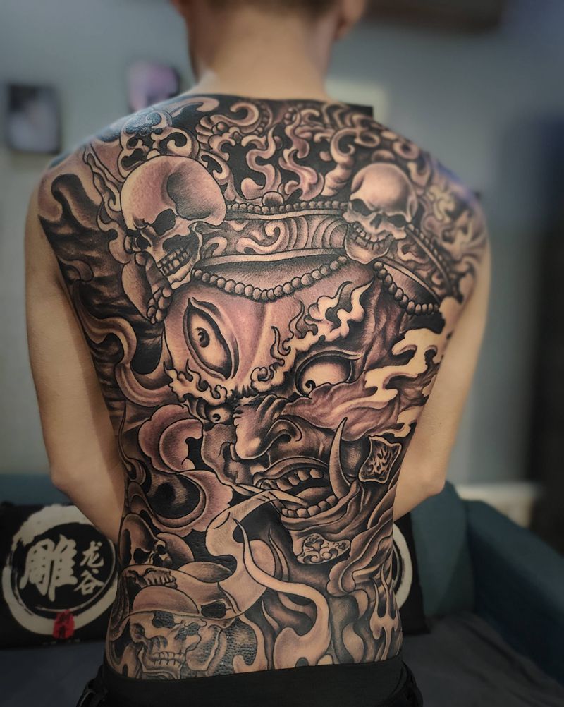 雕龙谷刺青大黑天财神纹身图片_背部新传统纹身图案