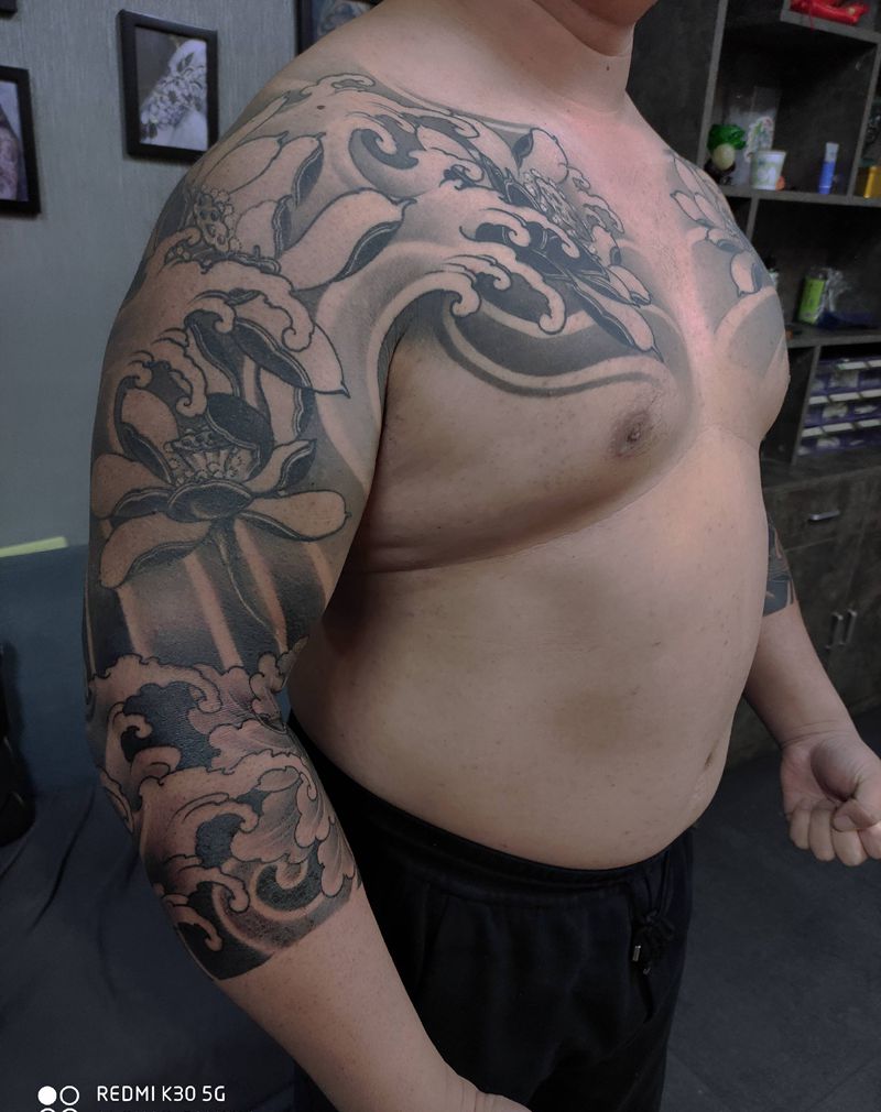 当前位置: 首页 >辽宁省沈阳市纹身店-沈阳雕龙谷刺青纹身图案>莲花牡丹七分袖纹身图片_胸部手臂新传统纹身图案