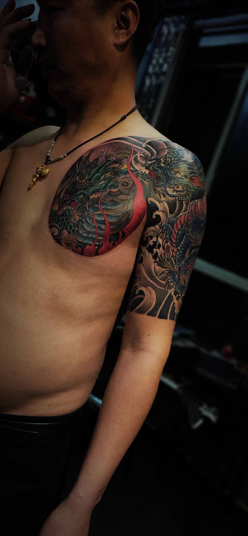 当前位置: 首页 >辽宁省沈阳市纹身店-沈阳雕龙谷刺青纹身图案>修改翻新老图纹身图片_肩部胸部新传统纹身图案