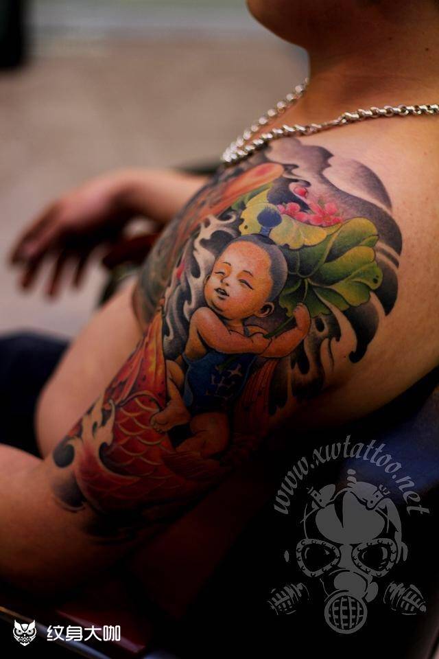 寿星福娃半甲纹身图片_小伟刺青胸部肩部传统原创纹身图案