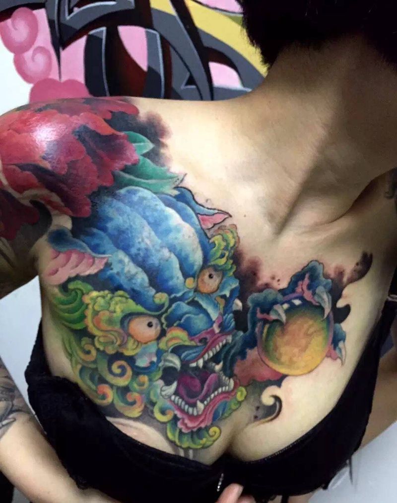 当前位置: 首页 >辽宁省大连市纹身店-大连小伟刺青纹身有限公司纹身图案>唐狮覆盖纹身图片_小伟刺青胸部传统纹身图案