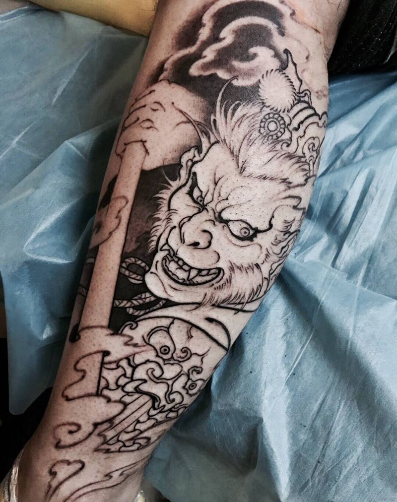 当前位置: 首页 >辽宁省大连市纹身店-大连小伟刺青纹身有限公司纹身图案>原创悟空纹身图片_小伟刺青传统腿部纹身图案
