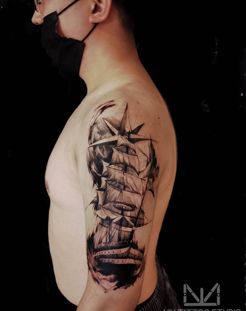 一帆风顺纹身图片_手臂水墨纹身图案