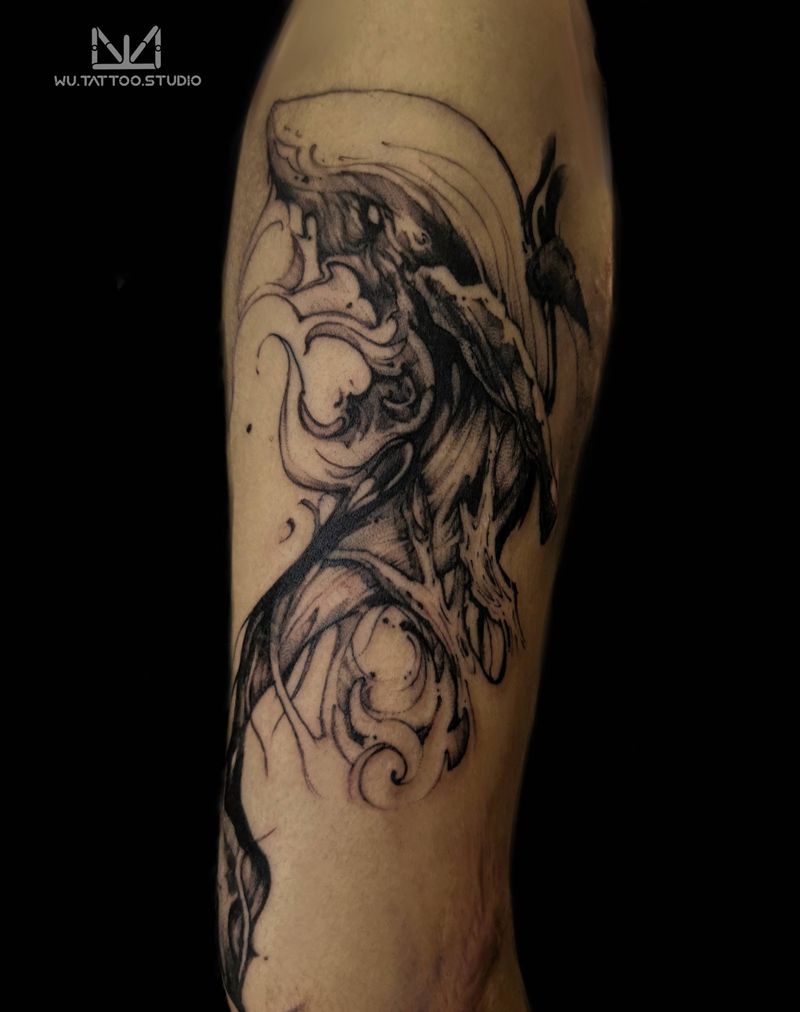当前位置: 首页 >辽宁省沈阳市纹身店-吾刺青-暗黑文化集合店纹身图案>疤痕遮盖鲸灵纹身图片_手臂腿部水墨欧美写实纹身图案