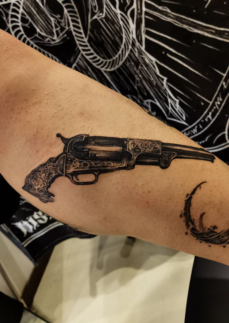 当前位置: 首页 >辽宁省沈阳市纹身店-吾刺青-暗黑文化集合店纹身图案>洋枪纹身图片_手臂腿部欧美写实纹身图案