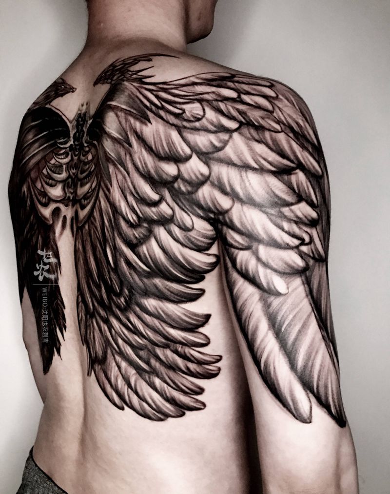 【黑暗与光明】纹身图片_背部胸部欧美写实New School羽翼翅膀满背纹身图案