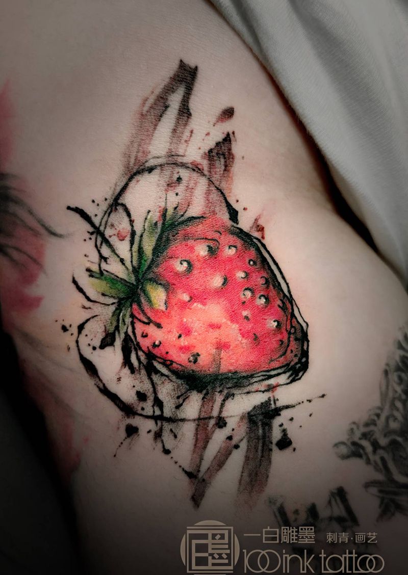 当前位置: 首页 >辽宁省大连市纹身店-一白雕墨 刺青画艺纹身图案>草莓纹身图片_手臂水彩草莓纹身图案