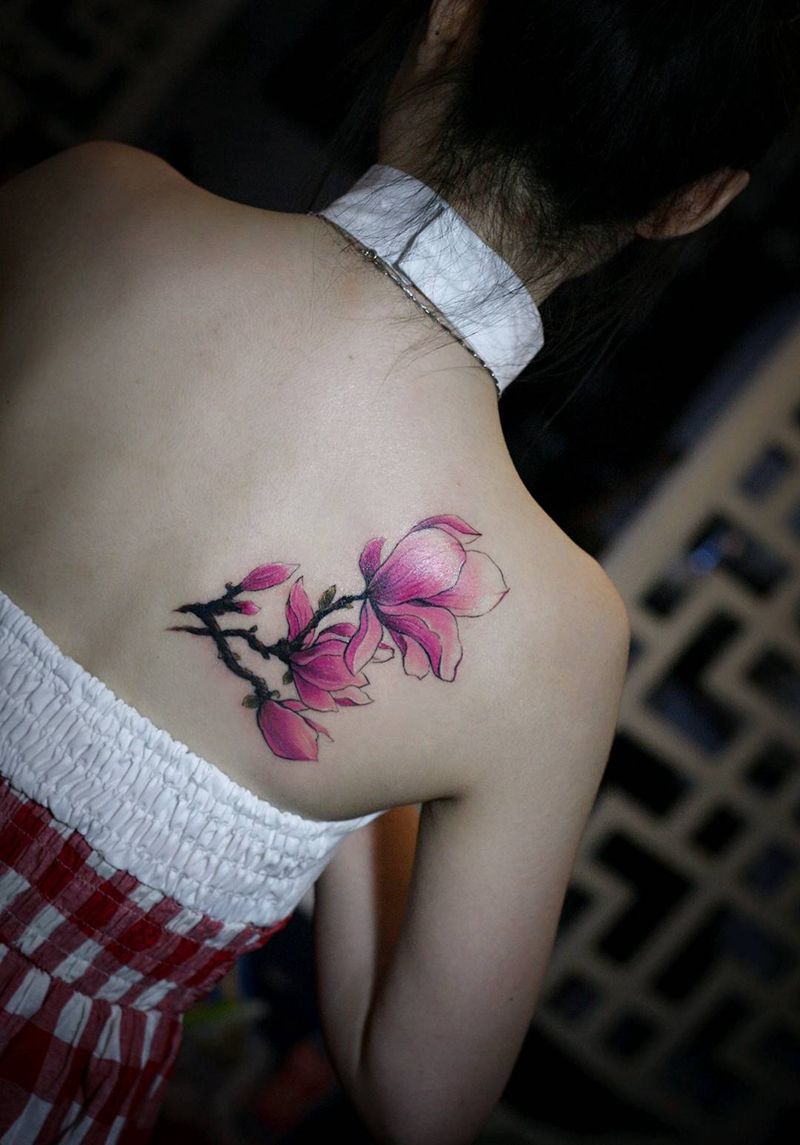 当前位置: 首页 >辽宁省大连市纹身店-一白雕墨 刺青画艺纹身图案>后肩玉兰纹身图片_肩部写实植物成品纹身图案