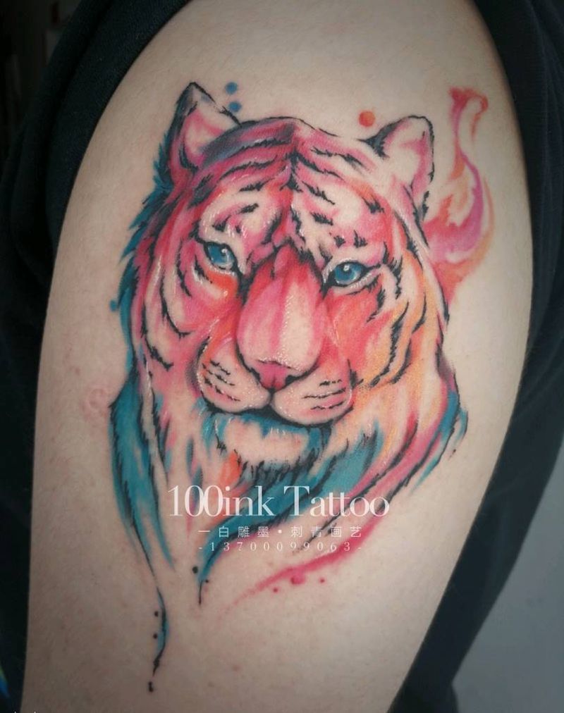 当前位置: 首页 >辽宁省大连市纹身店-一白雕墨 刺青画艺纹身图案>水彩老虎纹身图片_手臂水彩老虎纹身图案