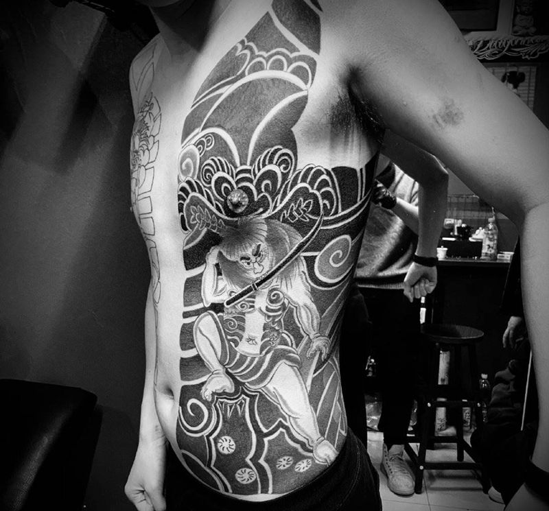 当前位置: 首页 >辽宁省沈阳市纹身店-骨雕部落刺青纹身图案>传统开衫纹身图片_胸部腹部老传统新传统开衫老传统张顺纹身图案