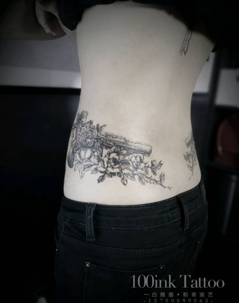 腰间花枪纹身图片_腰部欧美写实枪 花纹身图案