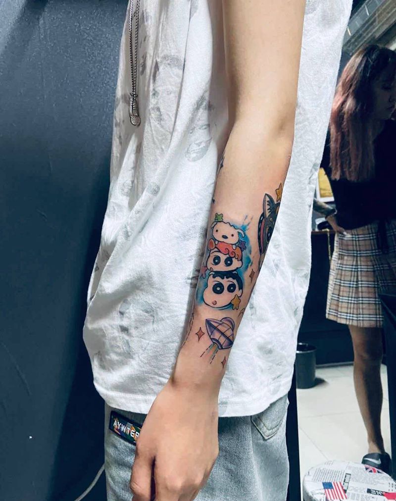 当前位置: 首页 >辽宁省沈阳市纹身店-骨雕部落刺青纹身图案>水彩蜡笔小新纹身图片_手臂New School水彩水彩school纹身图案
