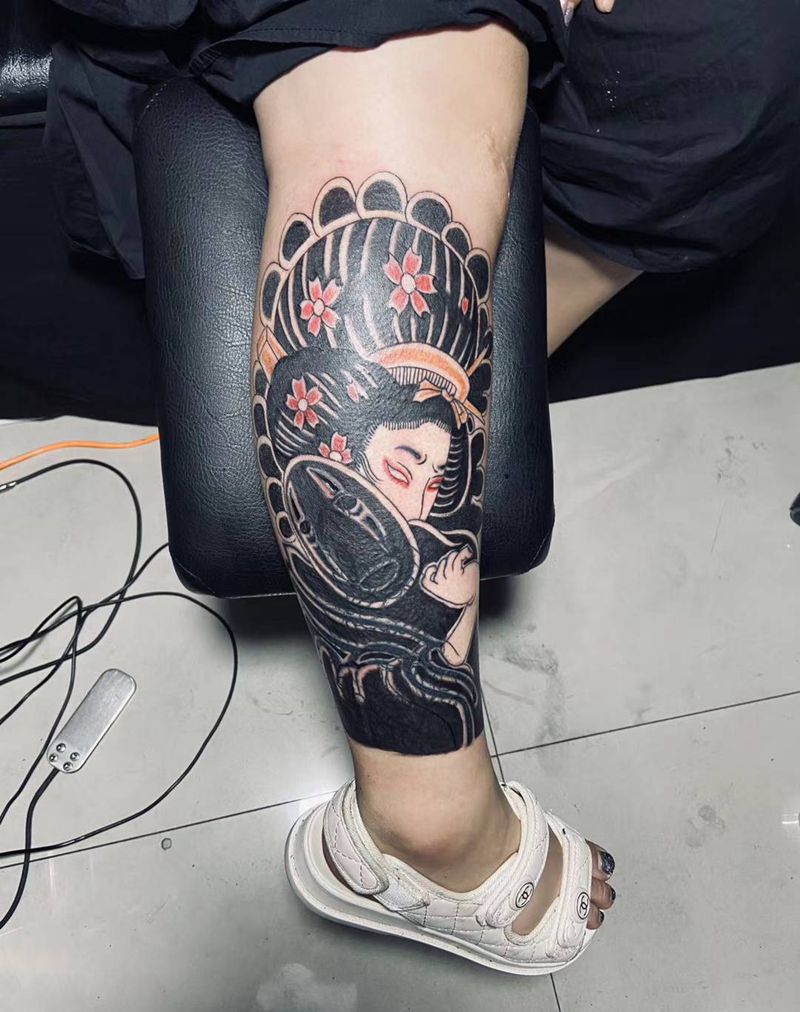 遮盖纹身图片_腿部老传统遮盖艺妓老传统纹身图案