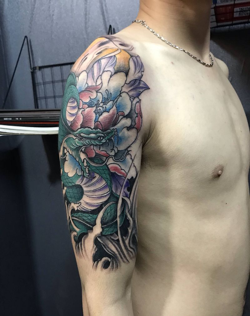蛇戏牡丹纹身图片_手臂新传统蛇牡丹纹身图案