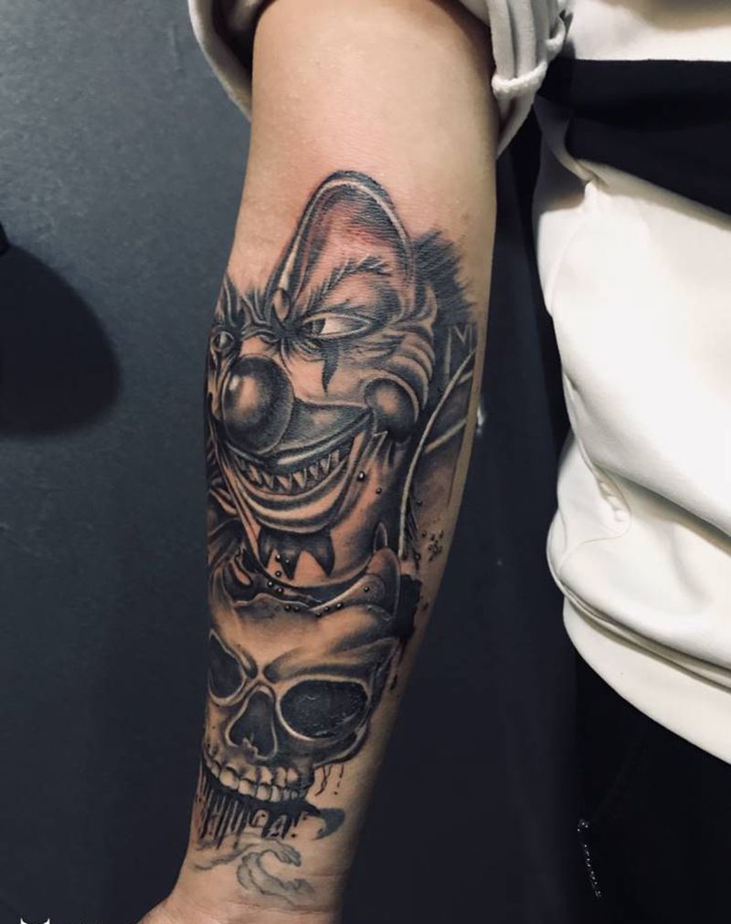当前位置: 首页 >辽宁省沈阳市纹身店-骨雕部落刺青纹身图案>小丑纹身图片_手臂欧美写实小丑纹身图案