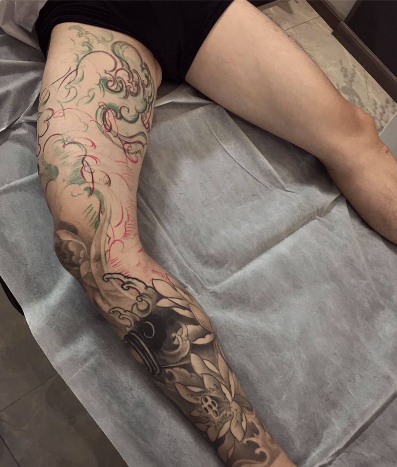 • T网红王老大花腿龙纹身图片_腿部新传统纹身图案
