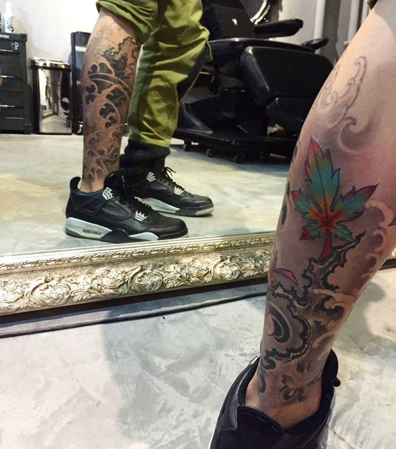 包小腿枫叶水浪纹身图片