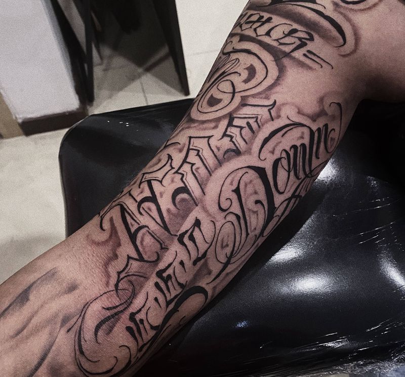 当前位置: 首页 >辽宁省沈阳市纹身店-合理刺青纹身图案>大臂花体字纹身图片_手臂花体字纹身图案