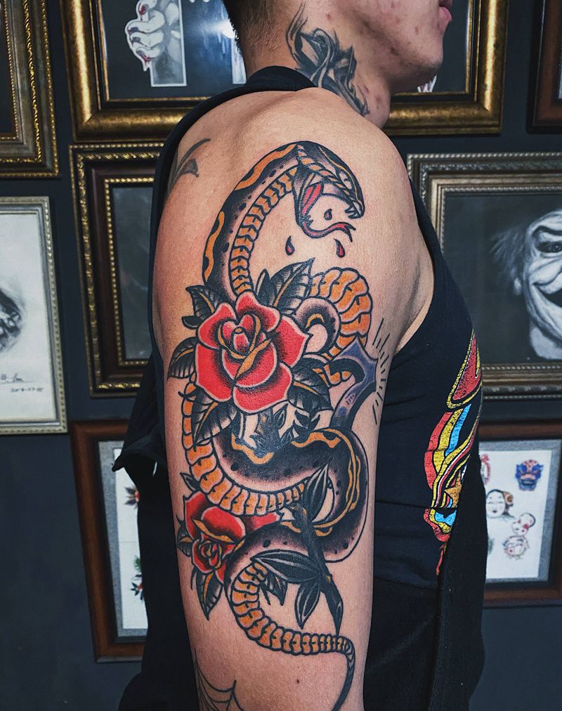 当前位置: 首页 >辽宁省沈阳市纹身店-合理刺青纹身图案>蛇与玫瑰纹身图片_手臂Old School纹身图案