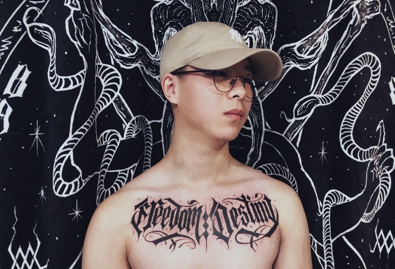 花体字纹身纹身图片_胸部花体字图腾英文纹身图案