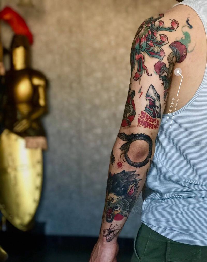 当前位置: 首页 >辽宁省大连市纹身店-大连华龙堂刺青纹身图案>school拼接纹身图片_手臂New School水彩纹身图案