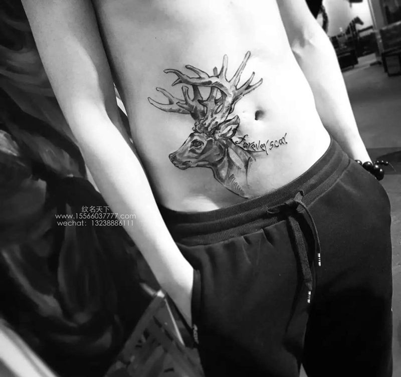 鹿纹身图片_腹部欧美原创动物纹身图案