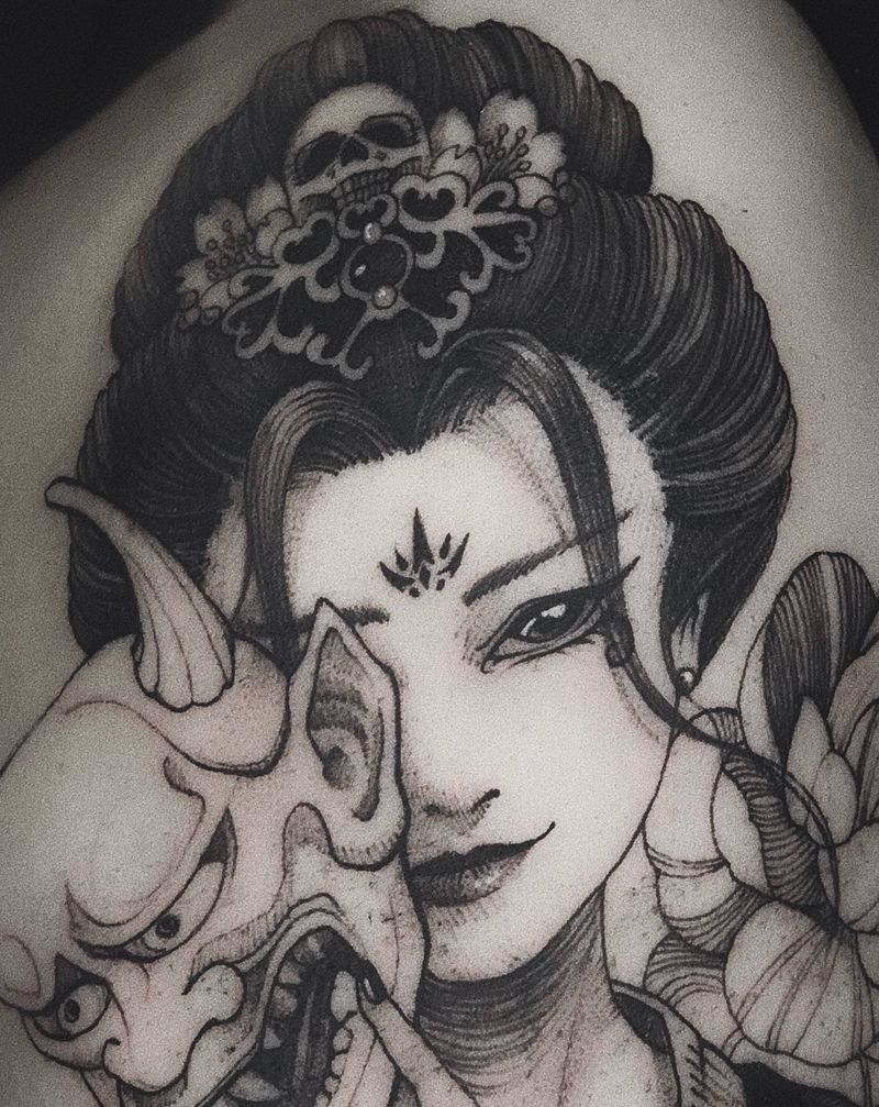 当前位置: 首页 >辽宁省大连市纹身店-玄铭堂纹身纹身图案>艺妓纹身图片_手臂新传统艺妓素花般若纹身图案