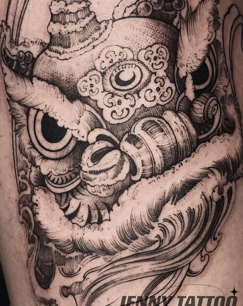 醒狮纹身图片_腿部点刺传统线条唐狮纹身图案